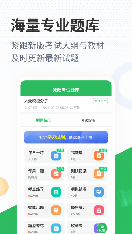 党政考试题库包含了党政考试普法知识竞赛、学习强国、党章考试、党规党纪知识考试、廉政法规考试、党建知识竞赛、党团知识竞赛、党务知识考试、党史知识竞赛、入党积极分子、知识竞赛等课程的历年真题及模拟试题题型,题库中的试题全真模拟真实的考试,更有强大的搜题功能,党政考试中的疑问一搜便知,更支持语音和拍照搜题。