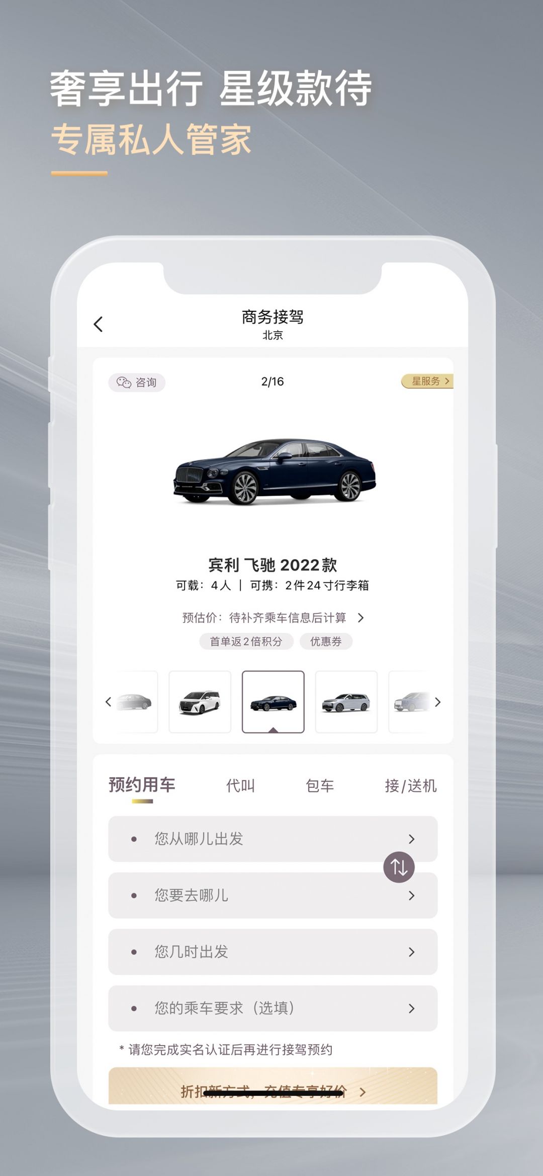 奢华出行:预约制点对点五星级接送服务,标配全球一线豪华品牌经典商务车型,尽享奢华人生。