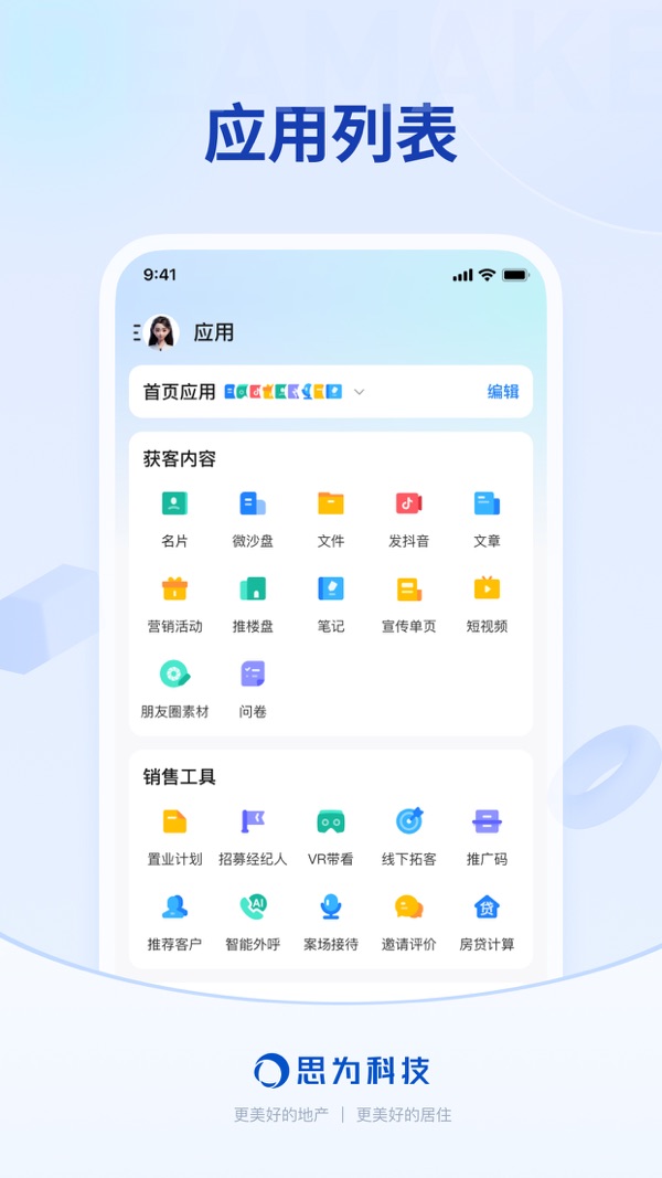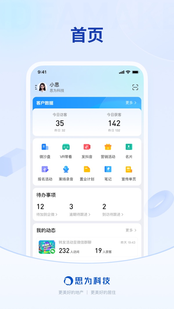 能力①:抖音获客引流。打通公域和私域,通过打造抖音房产内容钩子,个人可直接开白挂载抖音,同时呈现小风车更丰富+更易留资的内容场景快速形成流量转化,客户直接导入私域,抖音微信实现唯一客户判定。