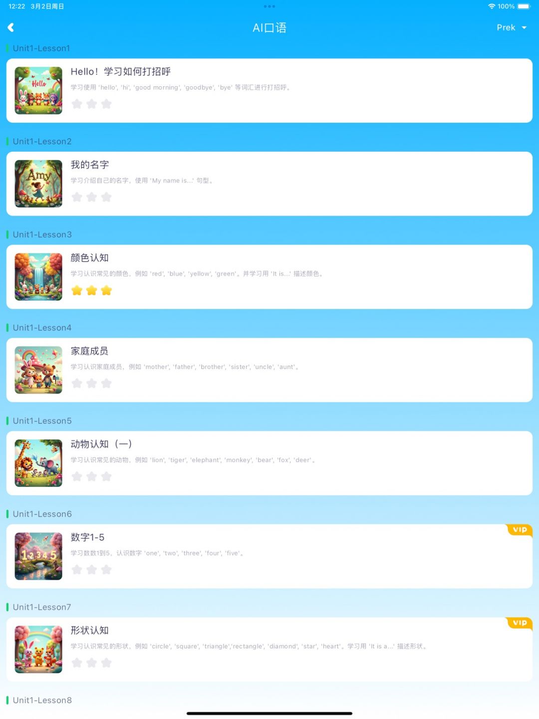 AI对话训练 —— 针对儿童英语口语学习的难点,提供AI智能对话练习,从PreK到4级,逐步提升孩子的英语交流能力,让开口说英语变得简单有趣!