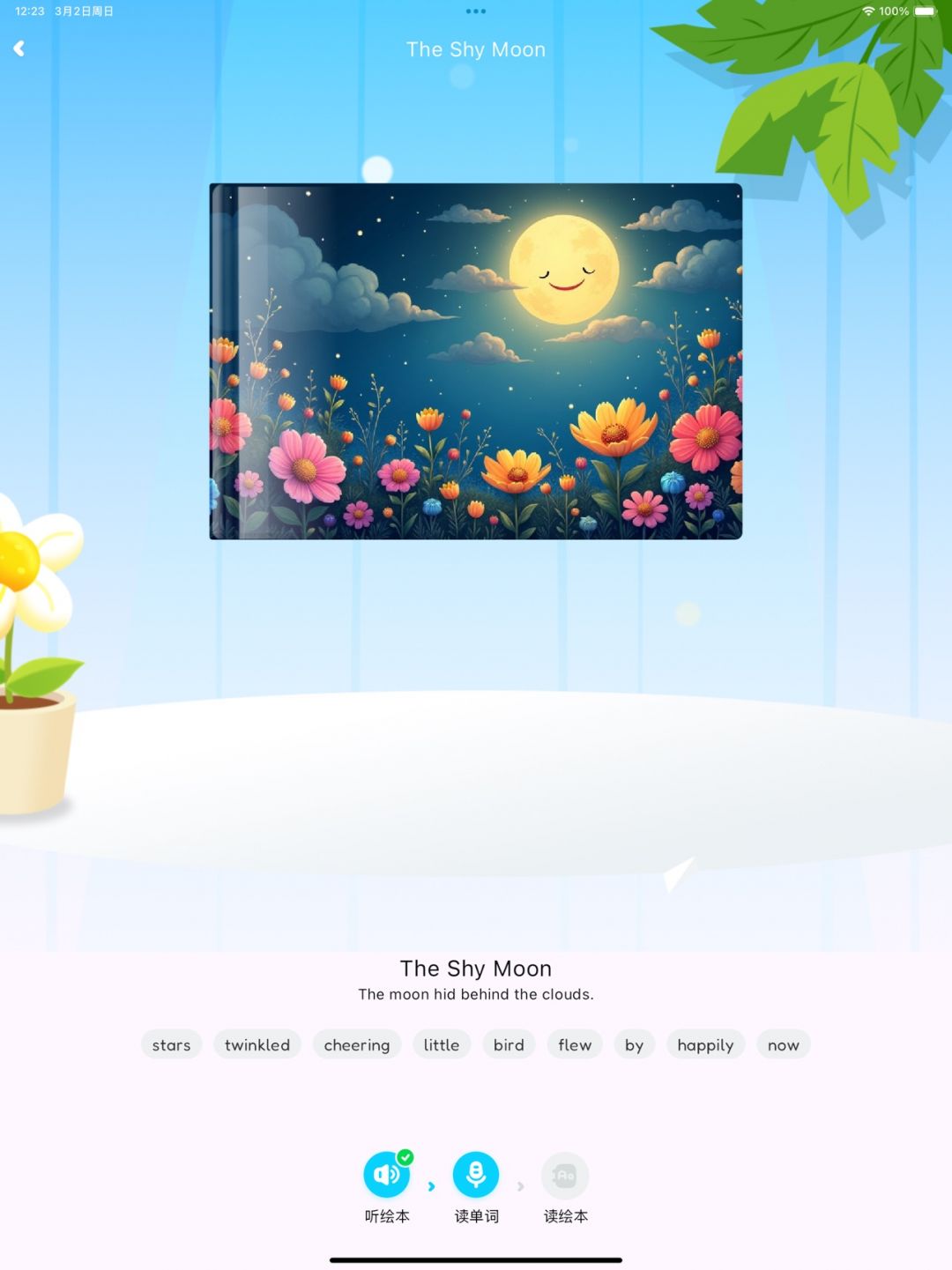 AI绘本阅读 —— 丰富的趣味绘本,支持听、读、练多种模式,让孩子通过故事学习词汇和句型,提升阅读理解能力。